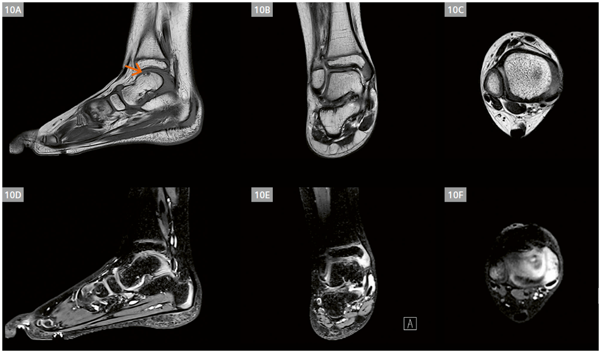 (10A–10F) First examination (right ankle) with conventional imaging acquired on a 3T MAGNETOM Skyra.